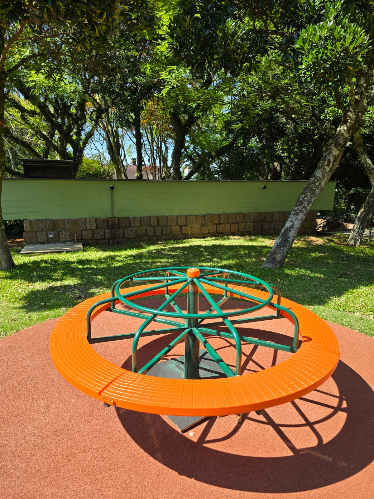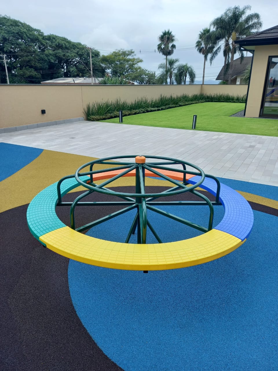 Medindo 2,00m de diâmetro, tem sua estrutura principal produzida em ferro galvanizado a fogo (não enferruja) e os assentos em plástico rotomoldado. Tais aspectos tornam este produto robusto e resistente, aumentando sua durabilidade.