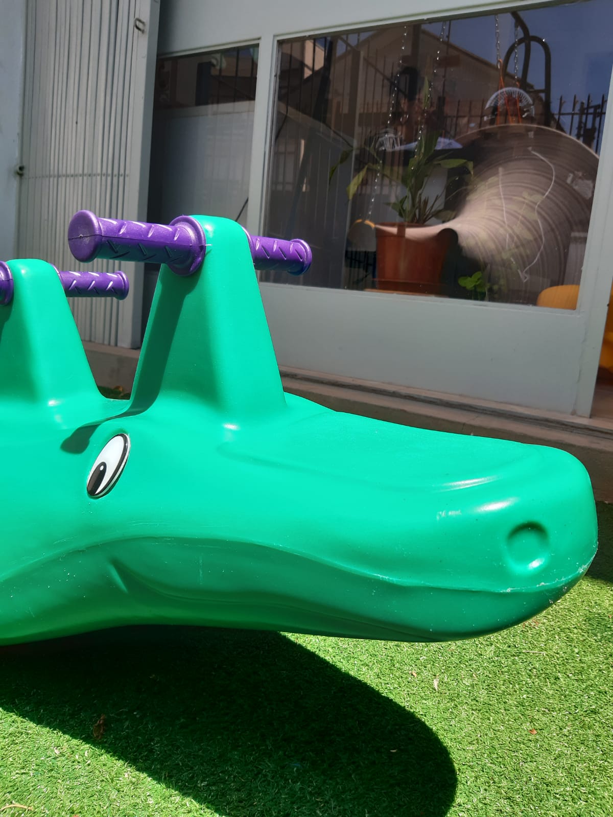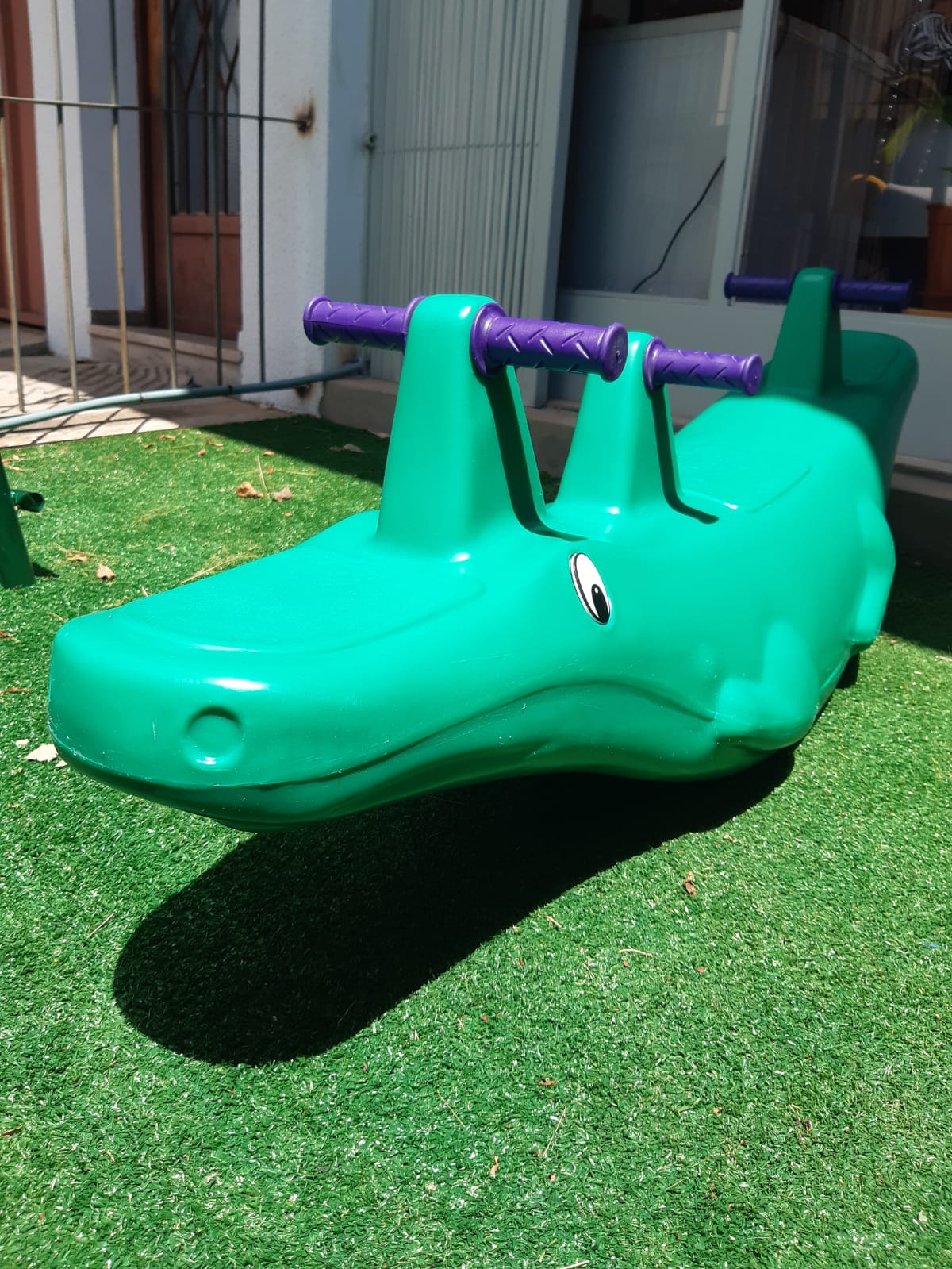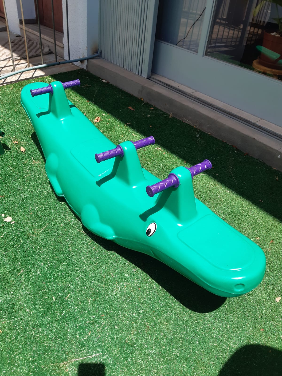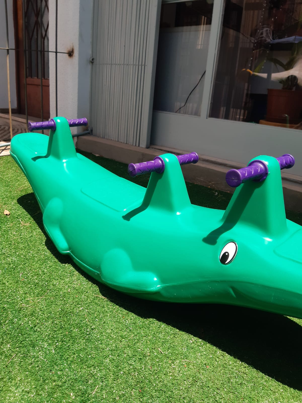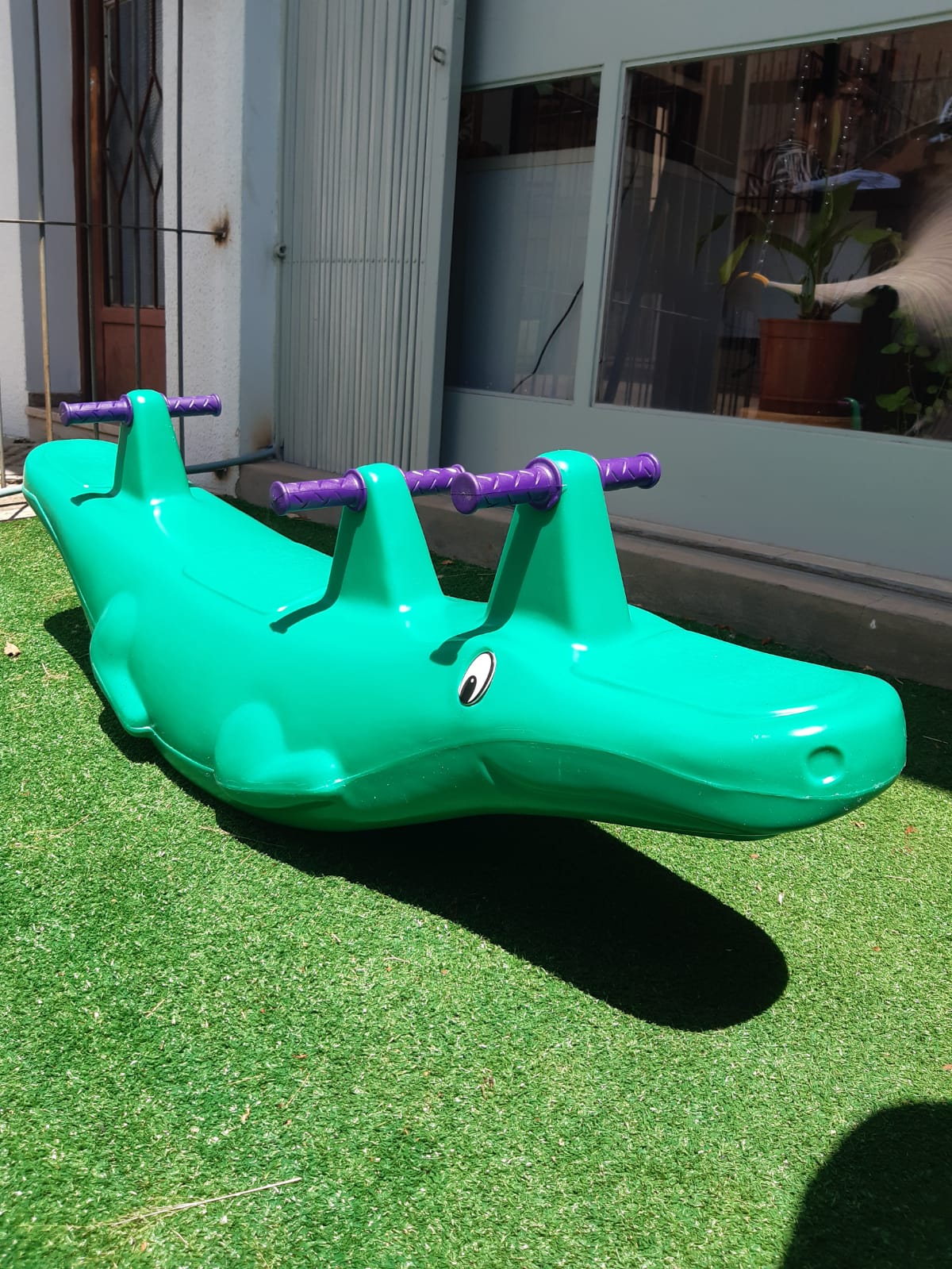 Gangorra de plástico, tripla (3 lugares), no formato de jacaré.