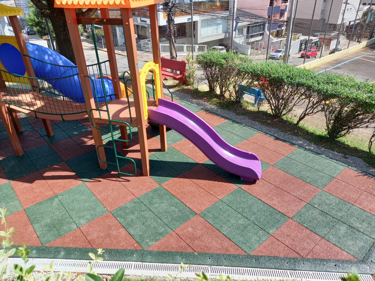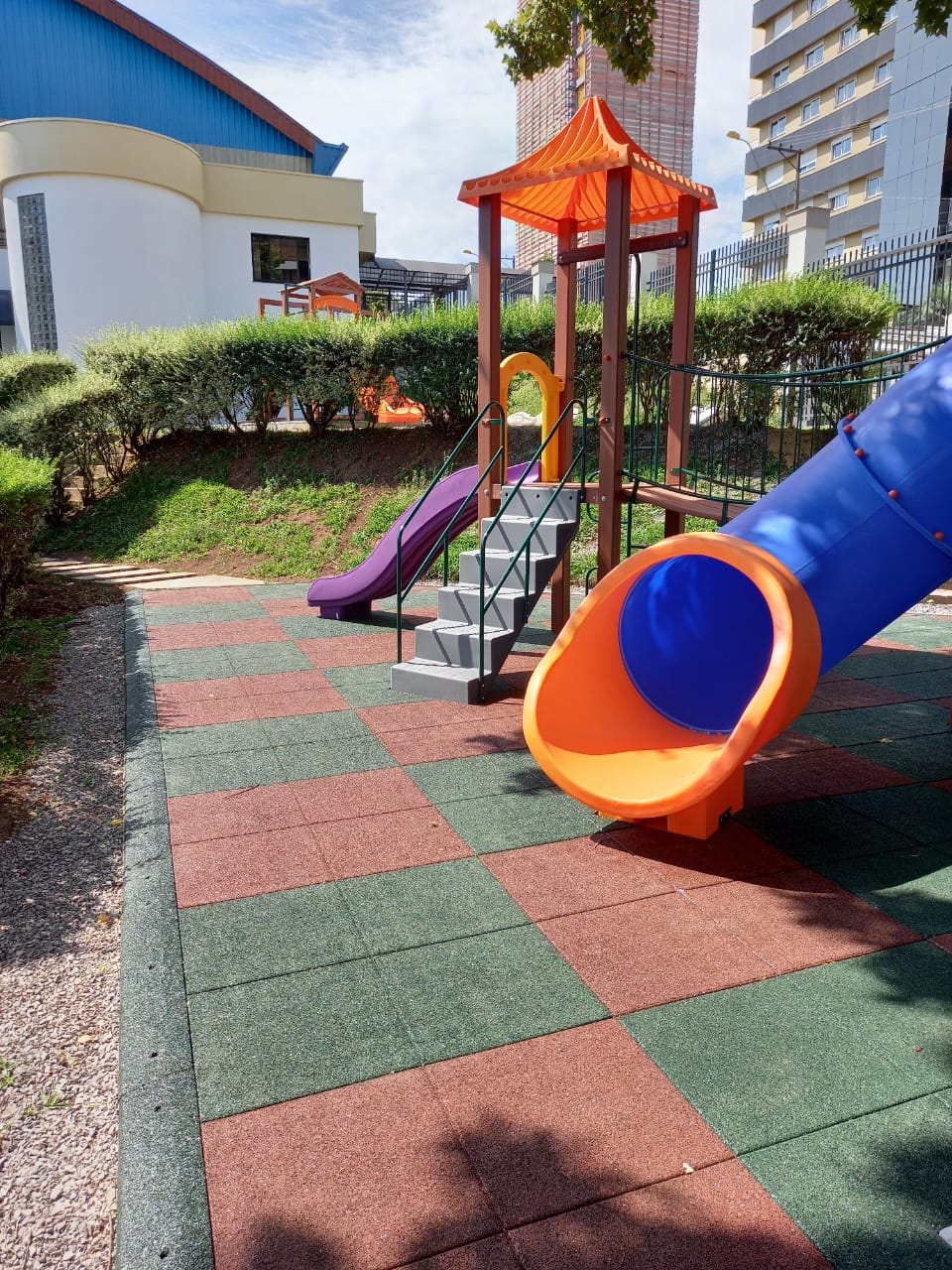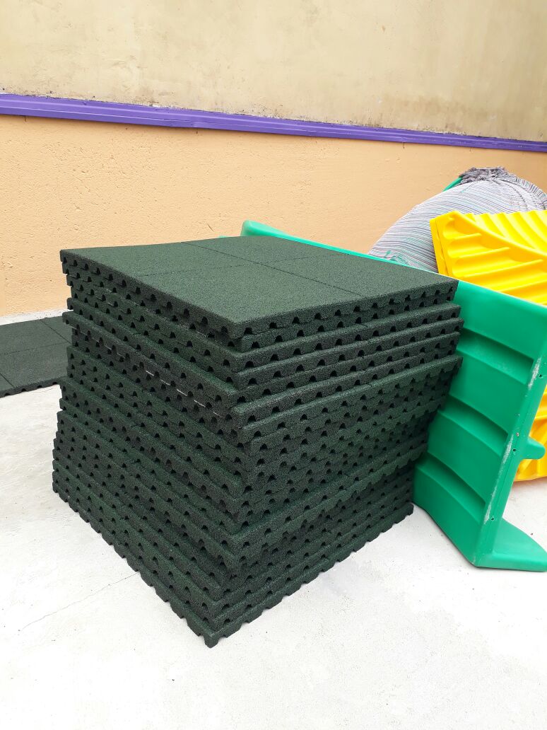 Piso emborrachado em placas medindo 1x1m, com 40mm de espessura, ideal para áreas de playgrounds.