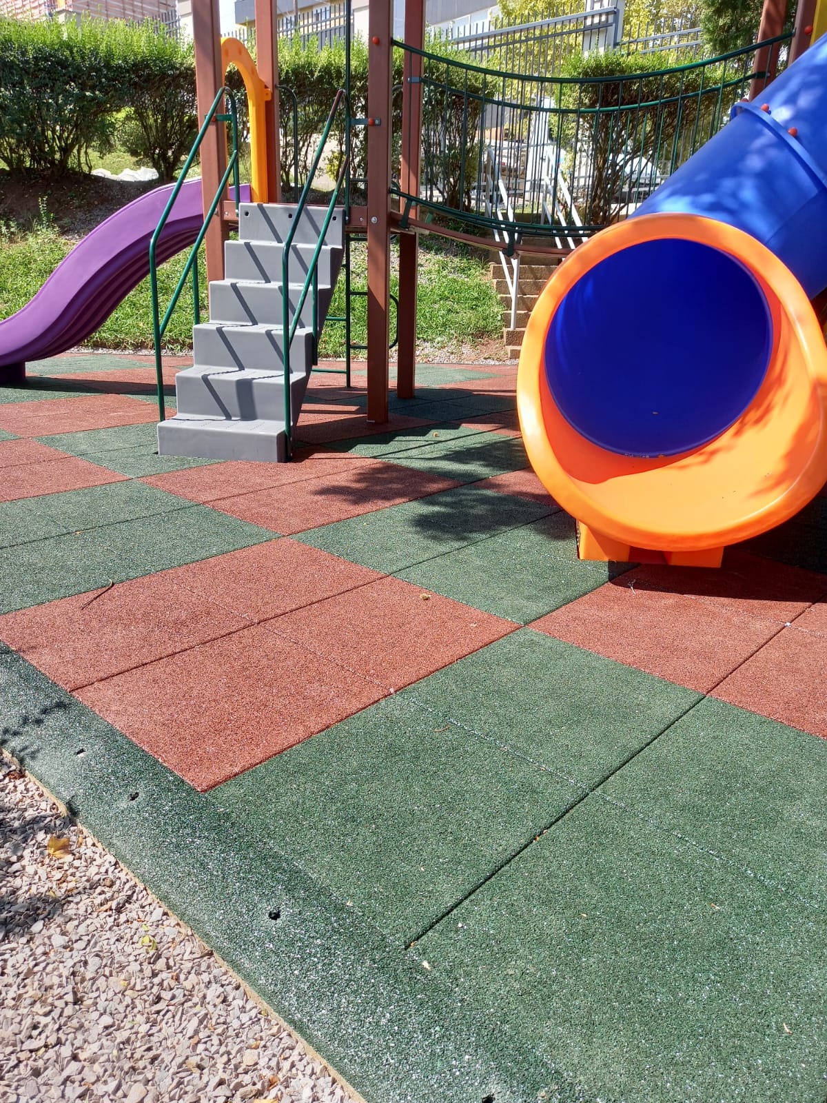 Piso emborrachado em placas medindo 1x1m, com 40mm de espessura, ideal para áreas de playgrounds. É antiderrapante, drenante e tem grande capacidade de absorção de impacto.