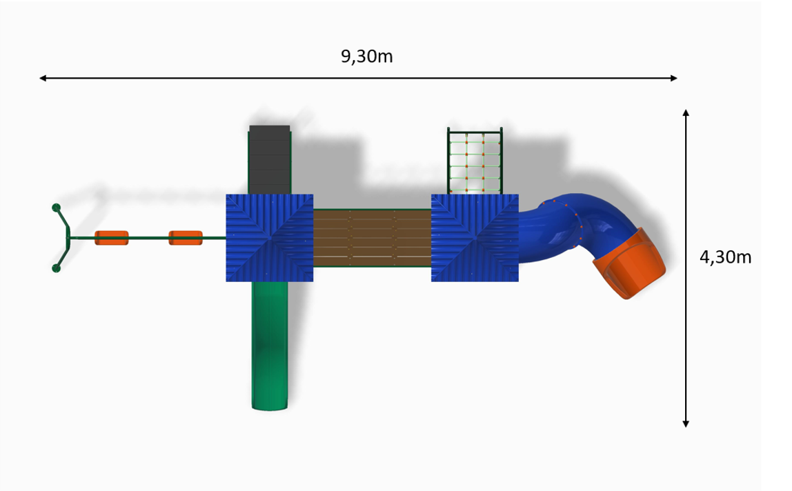 Este playground é estruturado em madeira plástica, com peças e componentes produzidos em plástico rotomoldado e ferragens galvanizadas a fogo. A utilização destes materiais resulta em grande durabilidade e pouquíssima manutenção, além de tornar o produto ecologicamente correto, ao evitar o uso de madeira natural. Além disso, este produto apresenta ótima resistência aos intempéries climáticos, como os raios solares UV, evitando o desbotamento precoce das peças de polietileno coloridos por pigmentação.